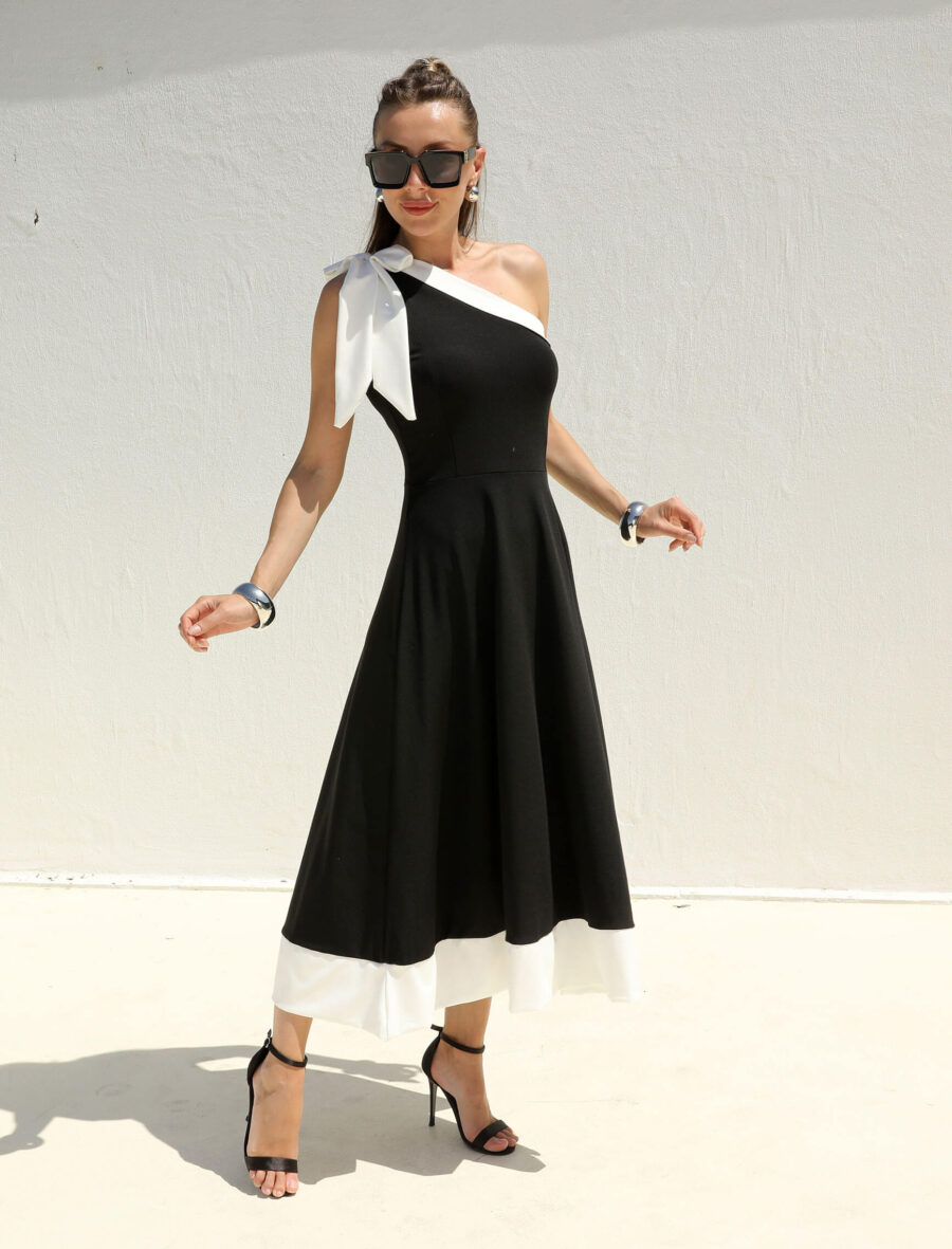 Tek Omuz Fiyonk Siyah Beyaz Elbise