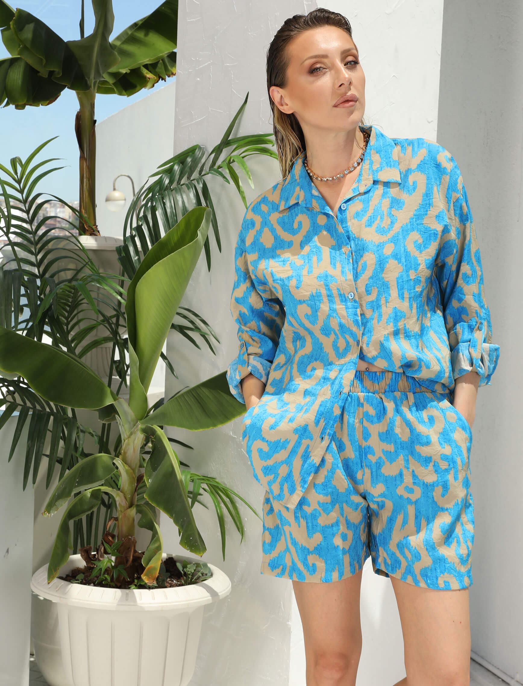 Turkuaz Bej Etnik Batik Şort Gömlek Takım
