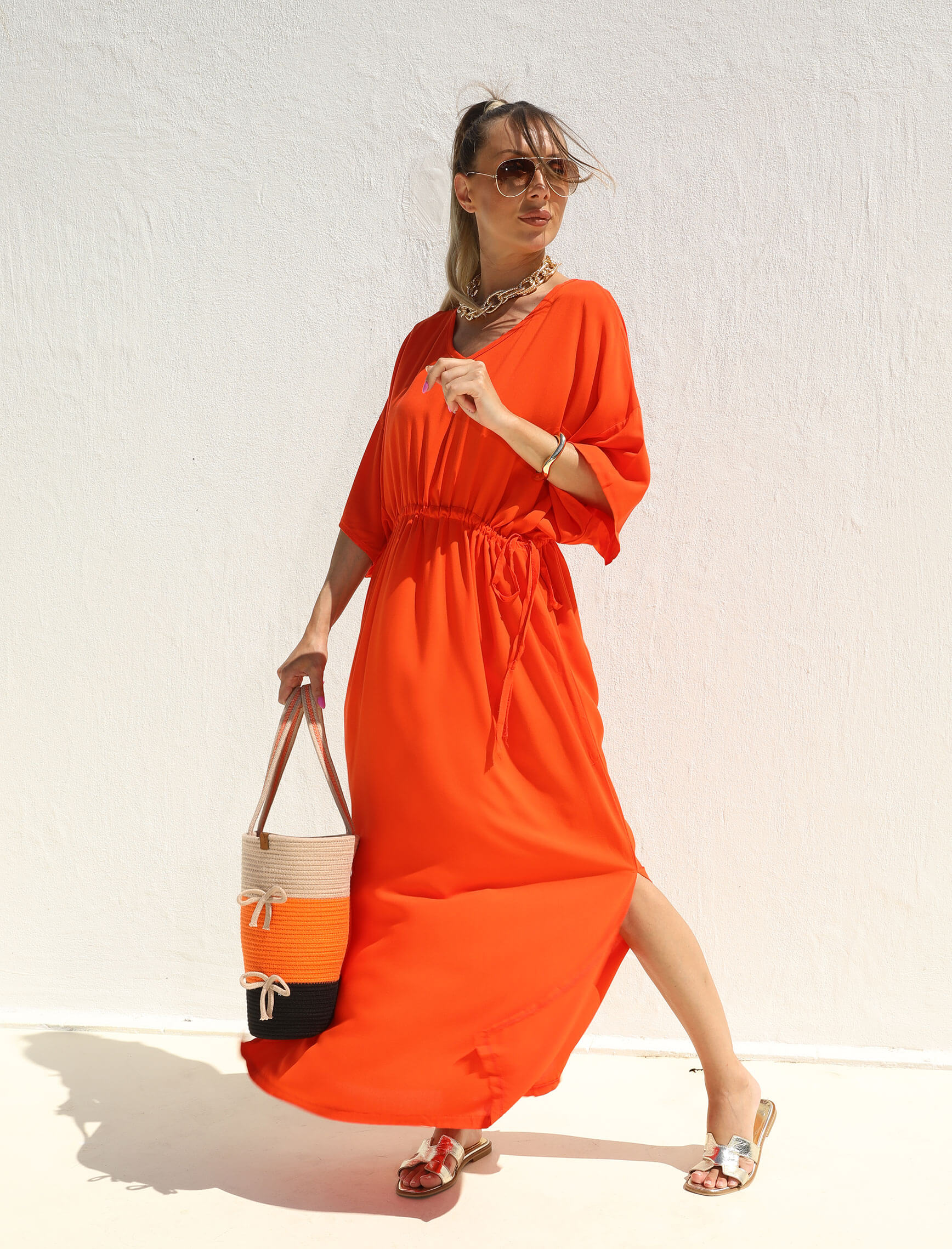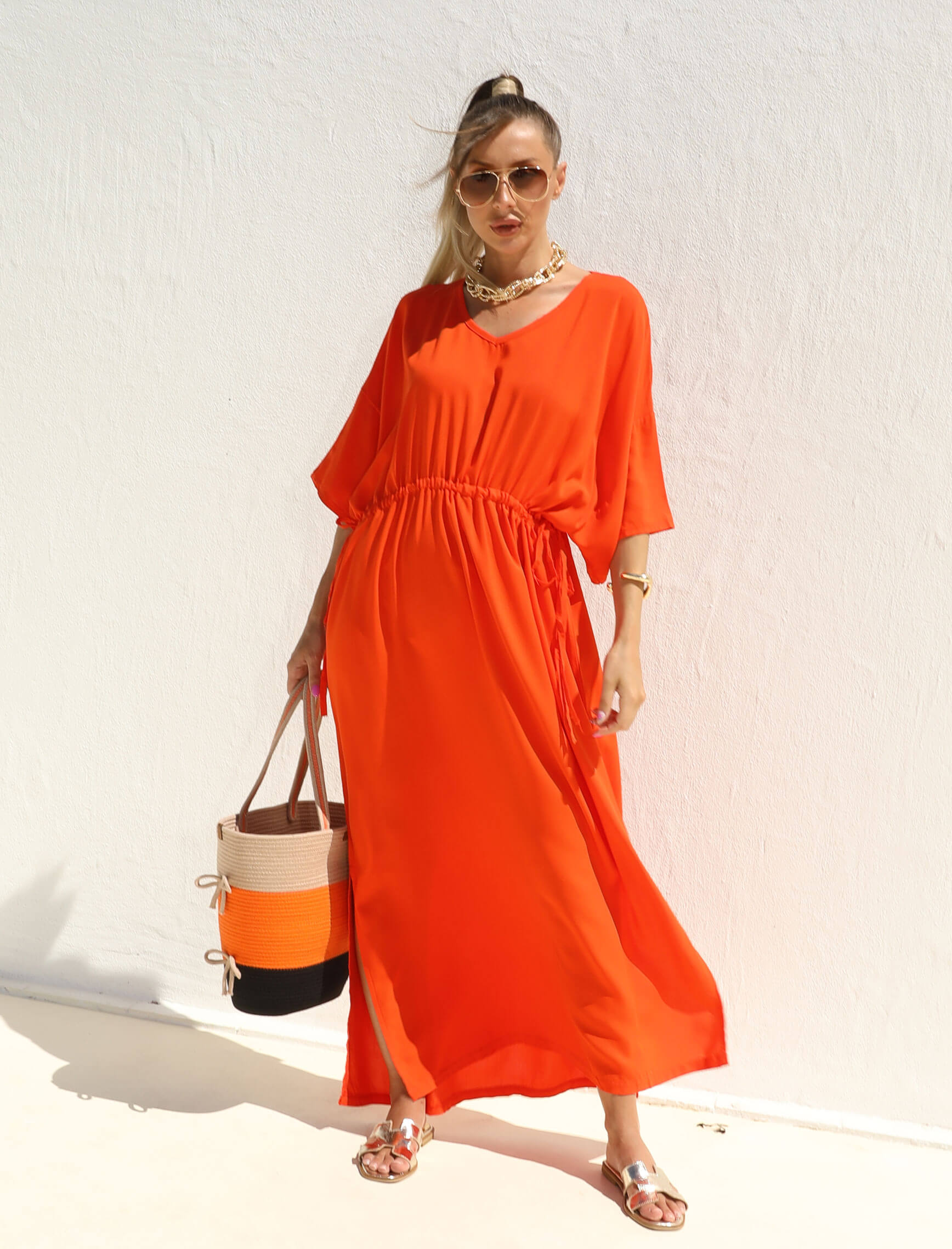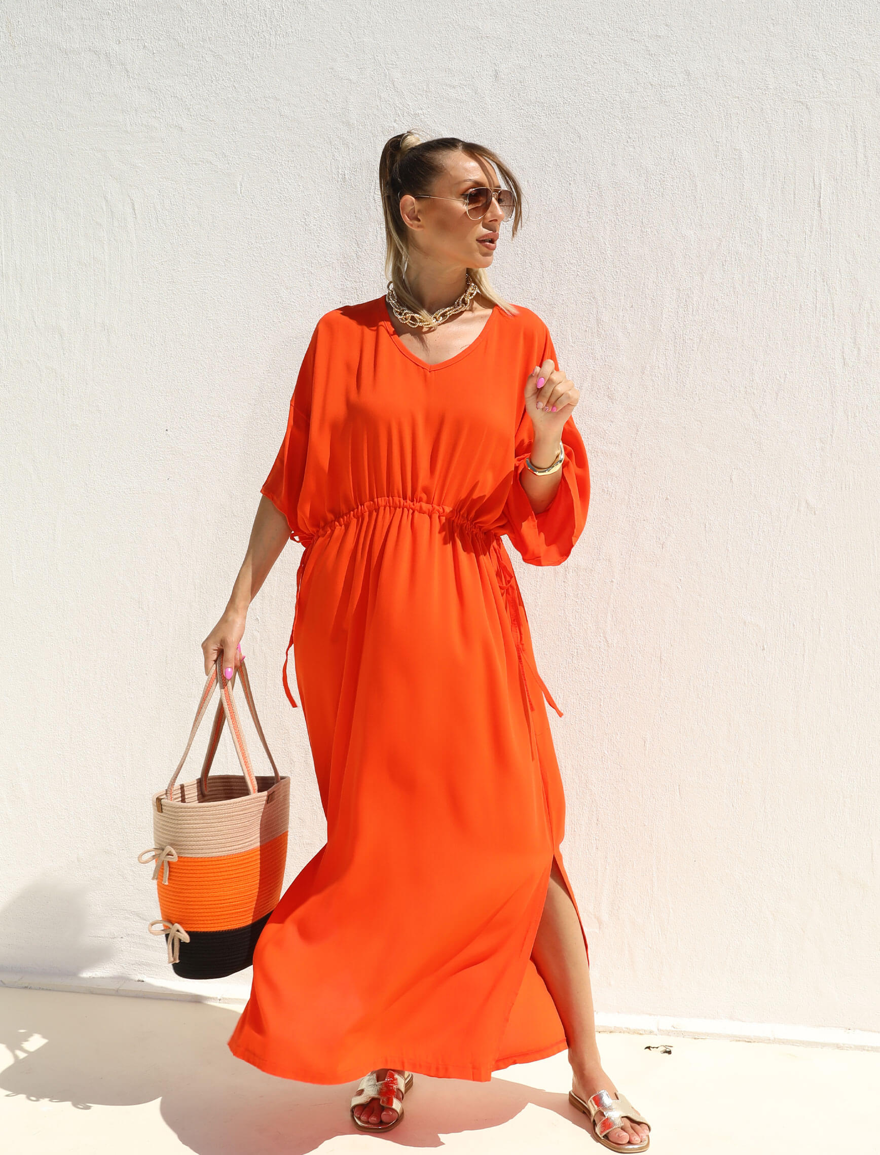 Turuncu V Yaka Büzgü Osto Elbise