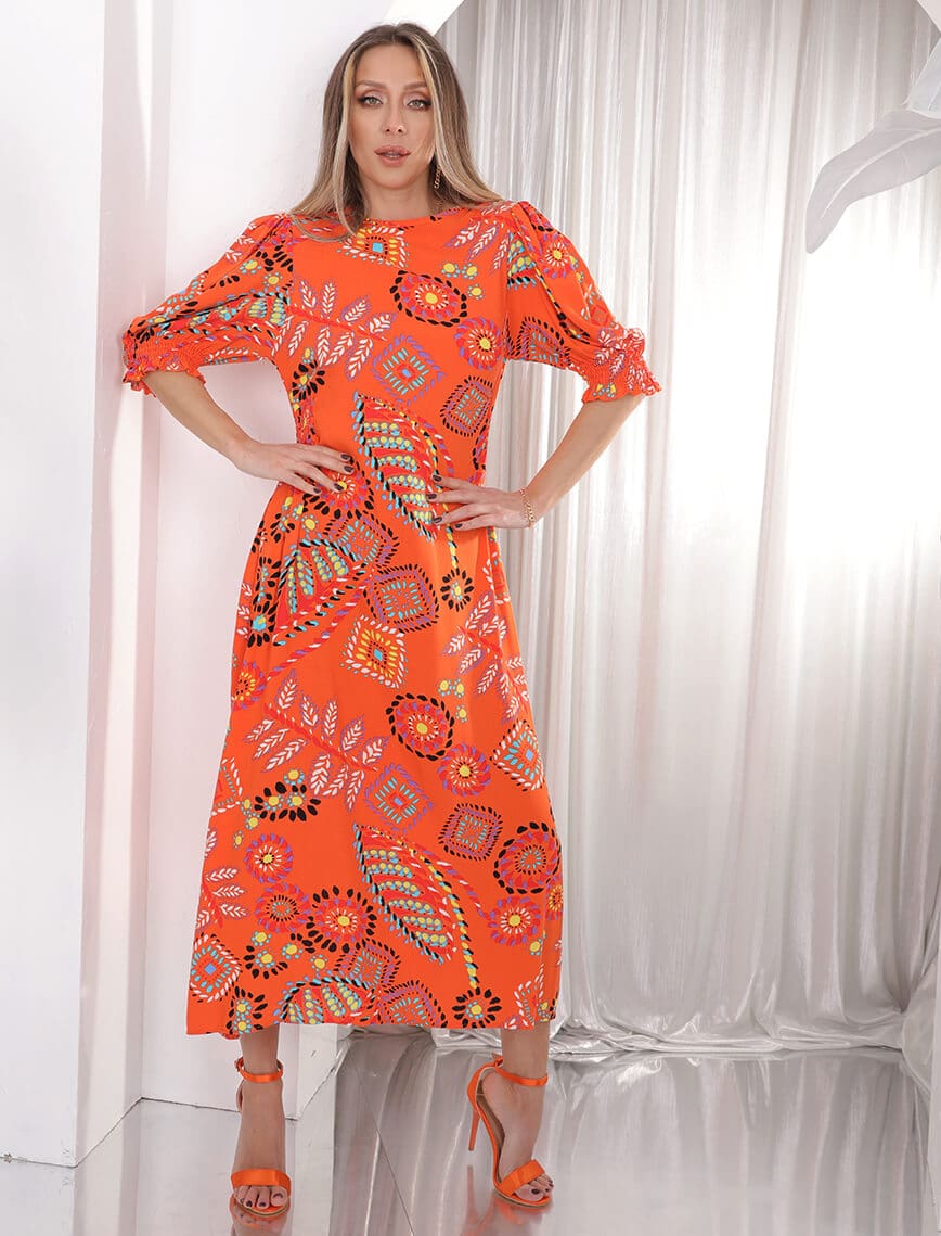 Turuncu Yaprak Çiçek Elbise
