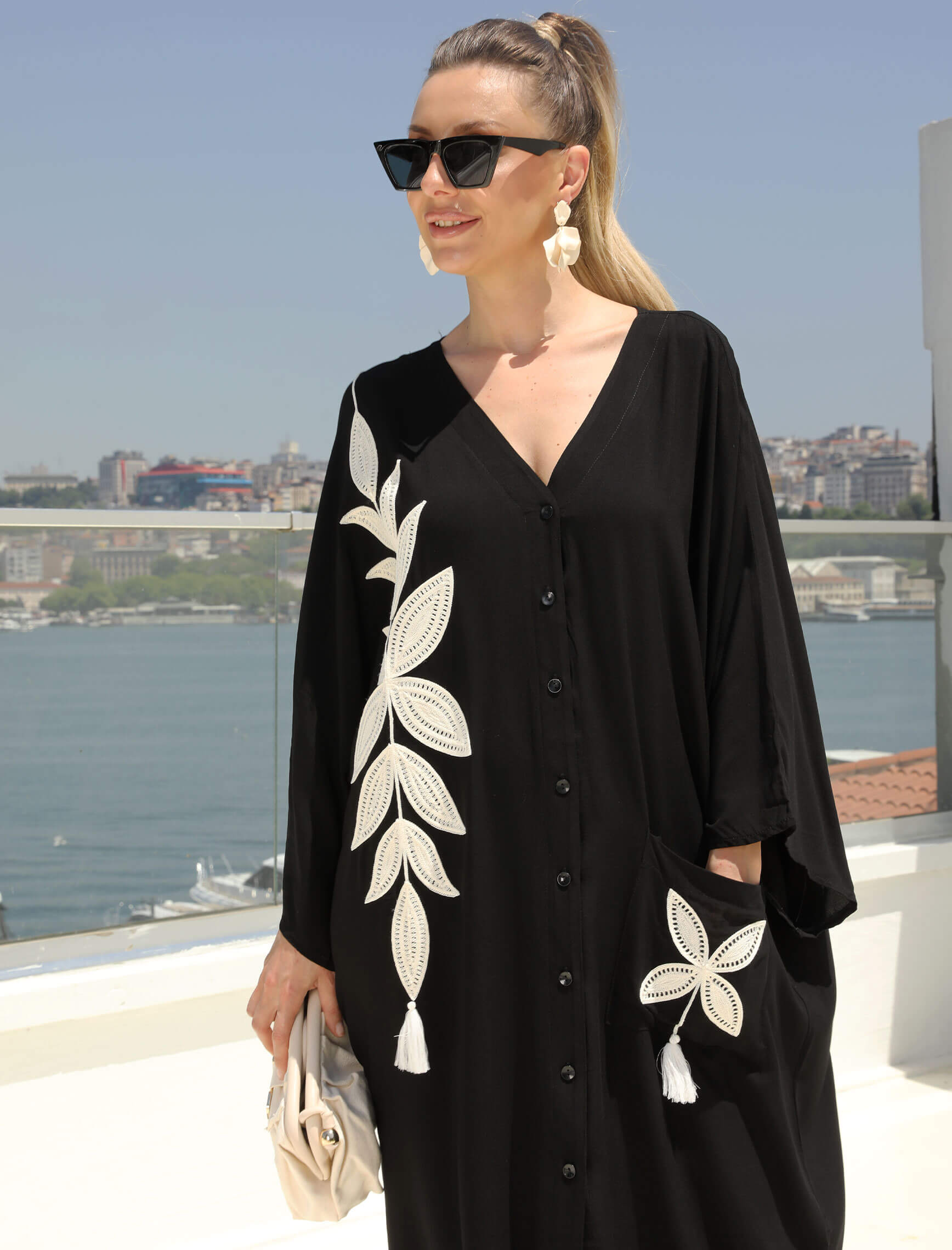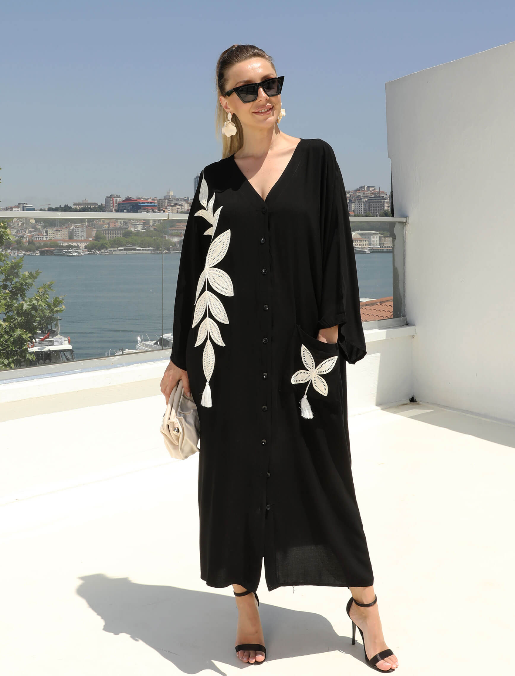 Yaprak Nakış Siyah Sahra Elbise