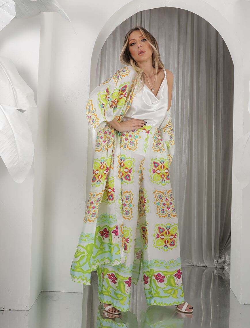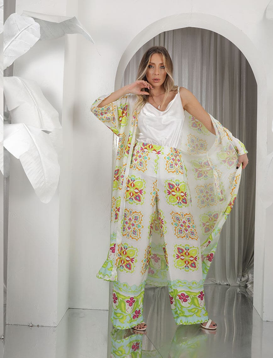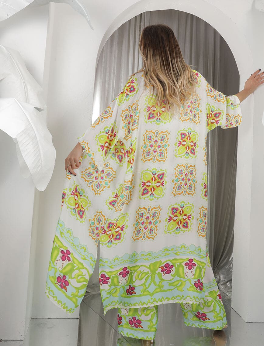 Yeşil Bej Dama Çini Desen Kimono Takım