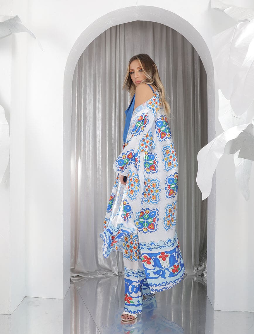 Beyaz Saks Dama Çini Desen Kimono Takım