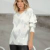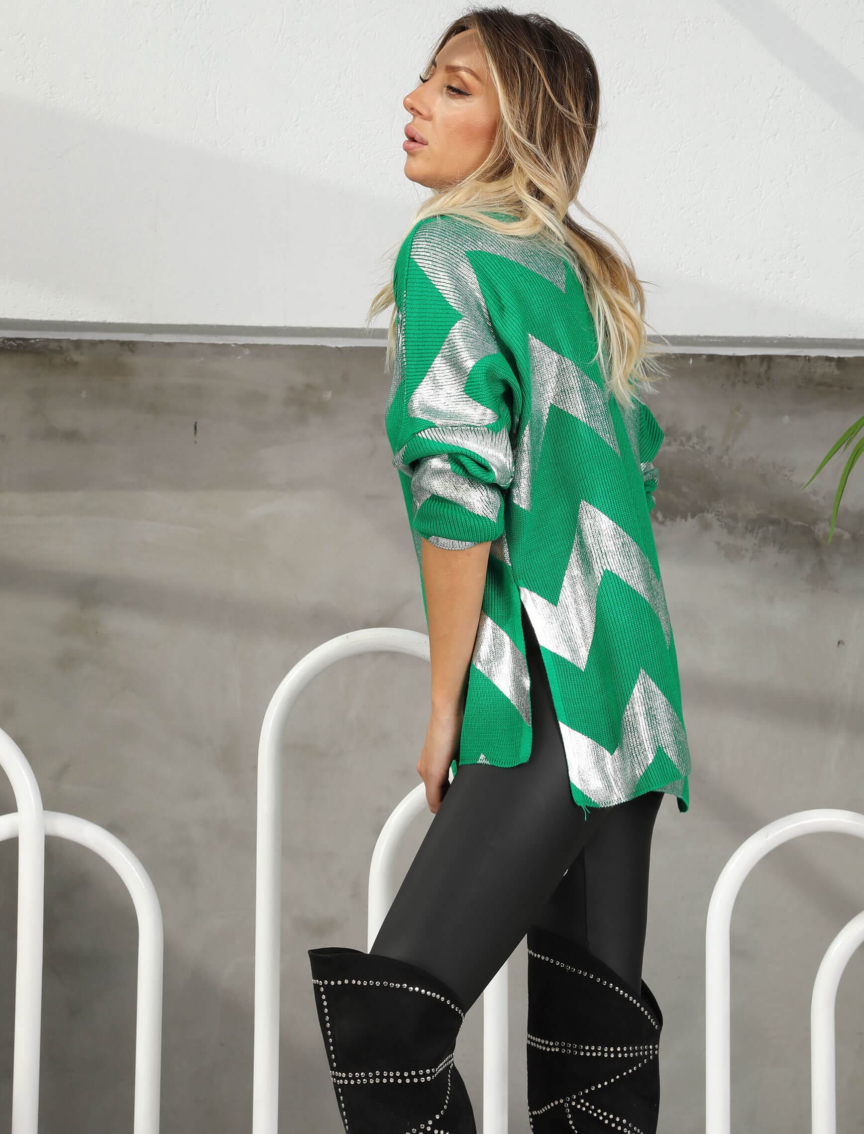 Yeşil Gümüş Zikzak V Yaka Triko