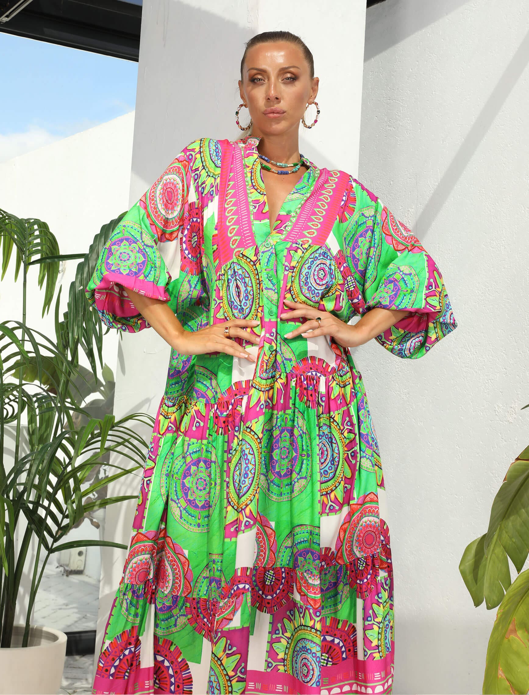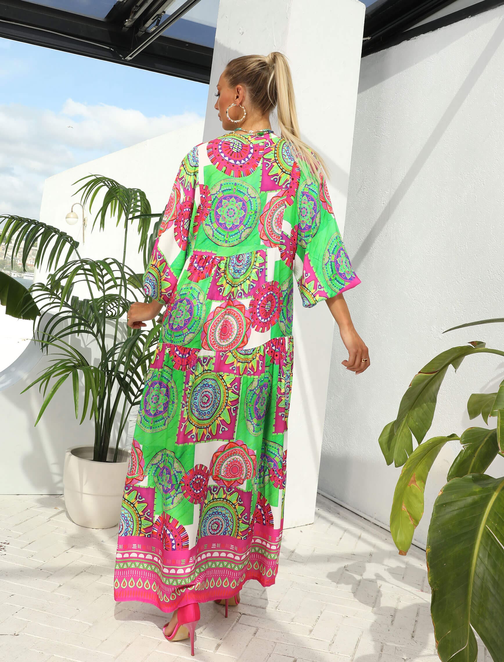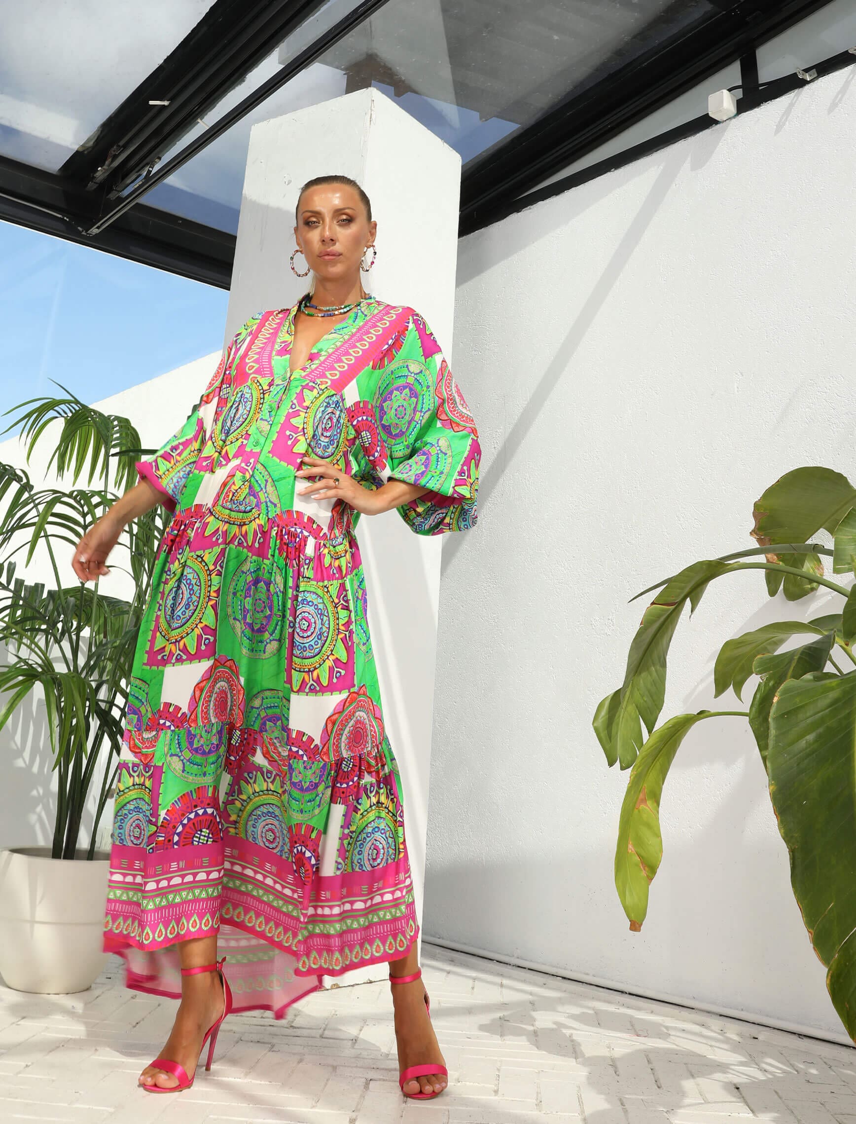 Yeşil Fuşya Renkli Mandalay Elbise