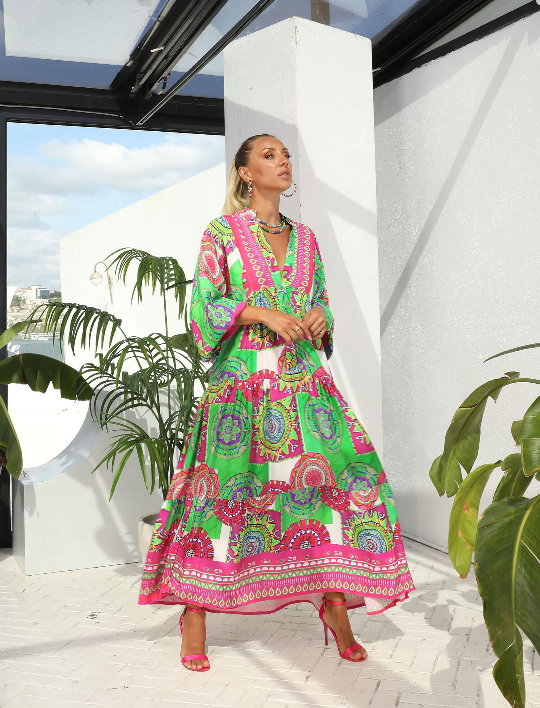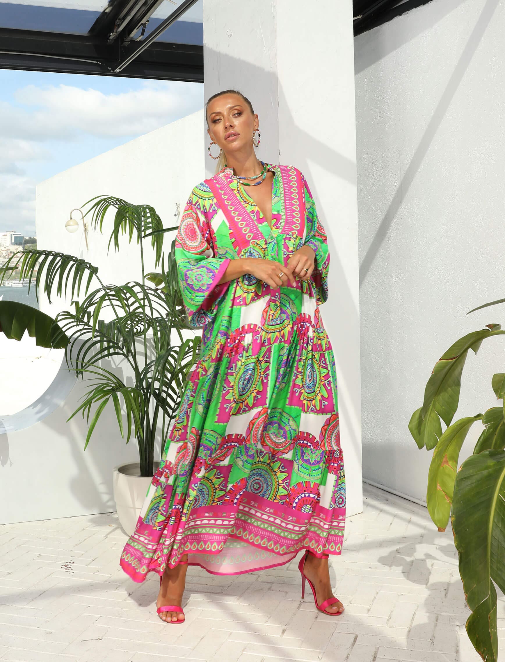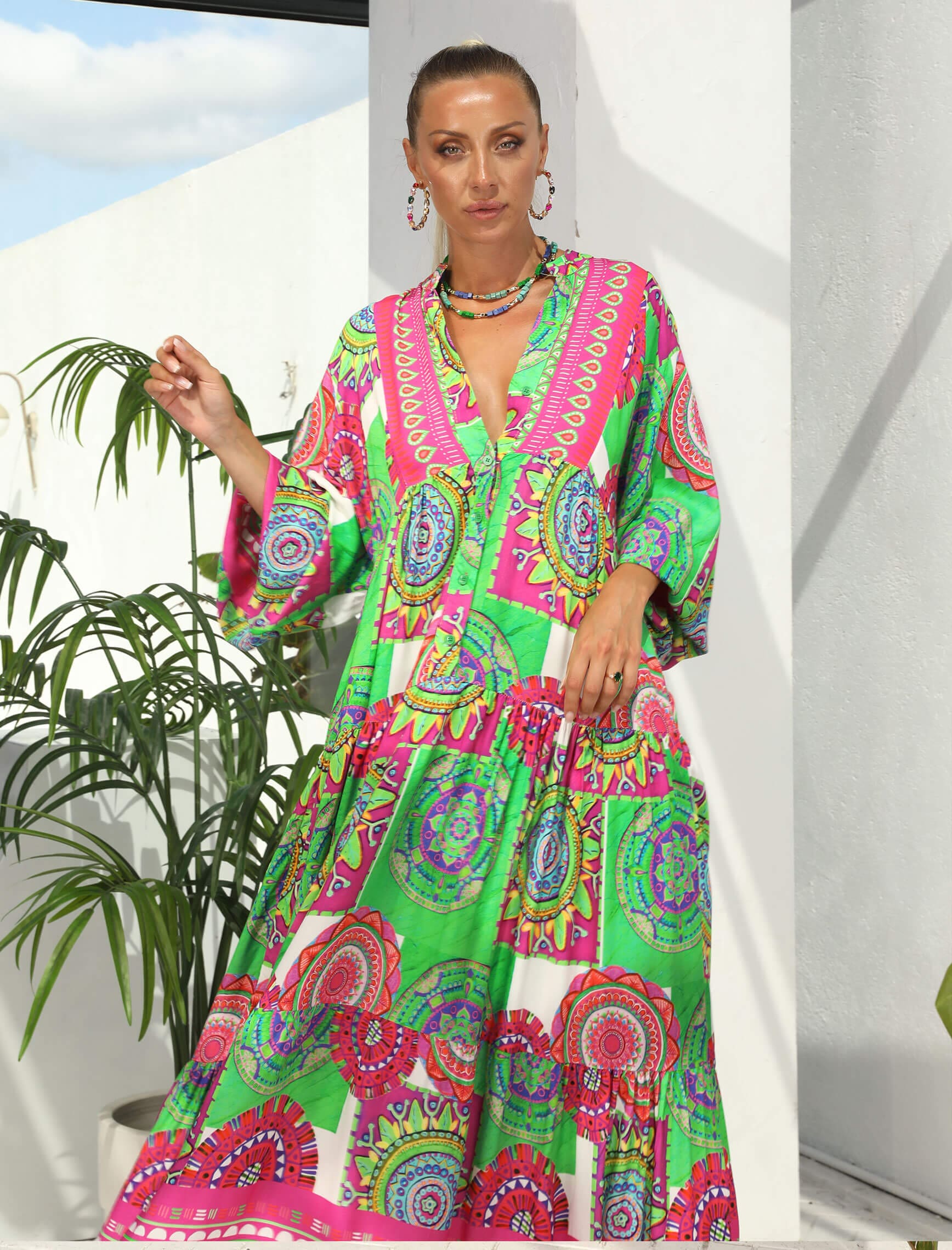 Yeşil Fuşya Renkli Mandalay Elbise