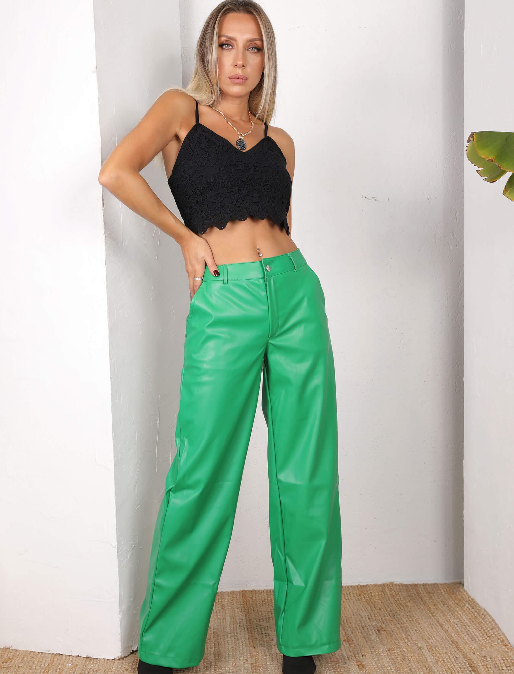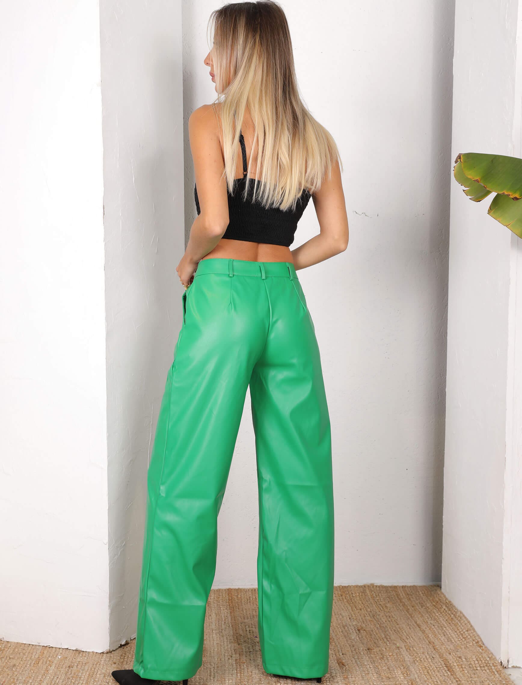 Yeşil Palazzo Deri Pantolon
