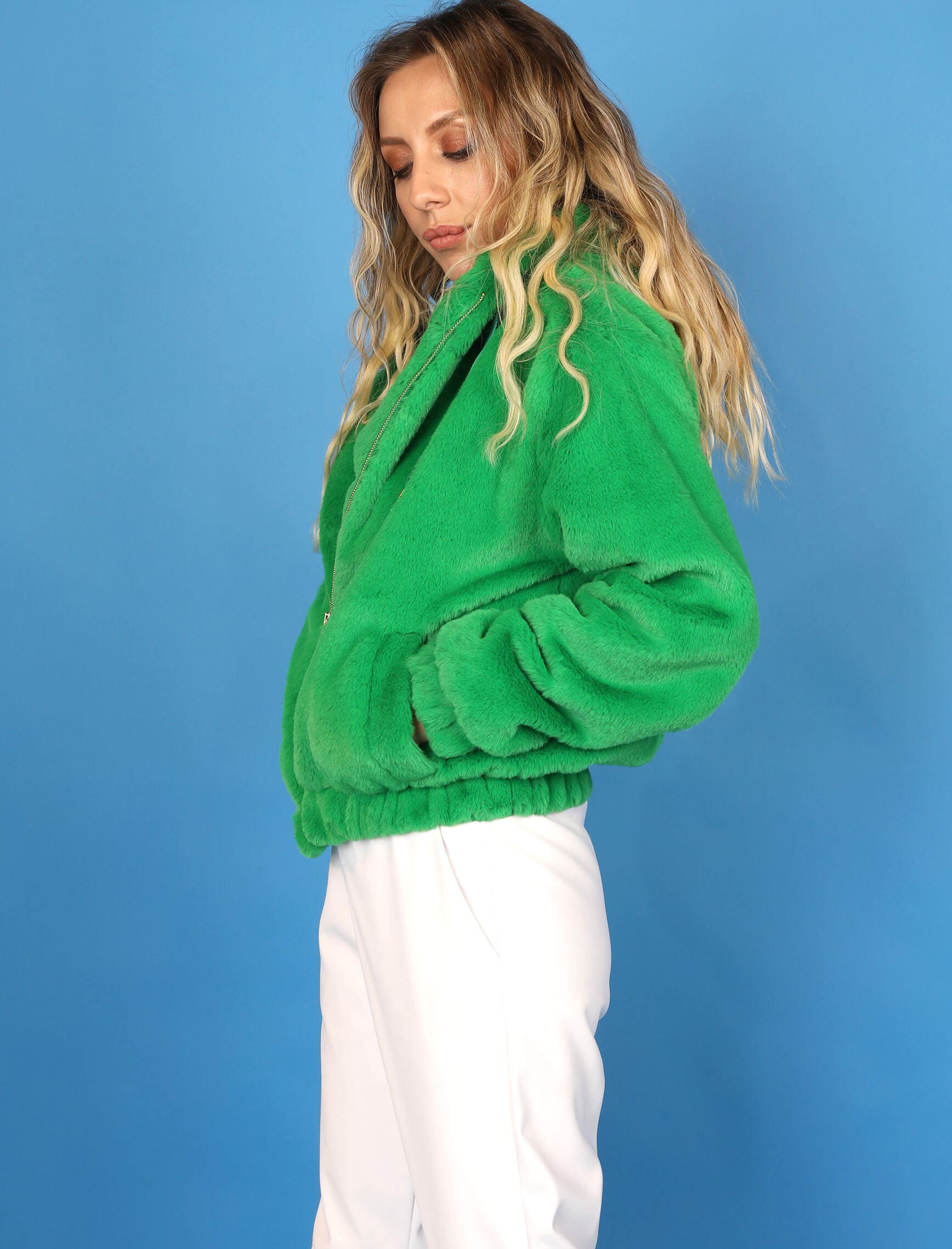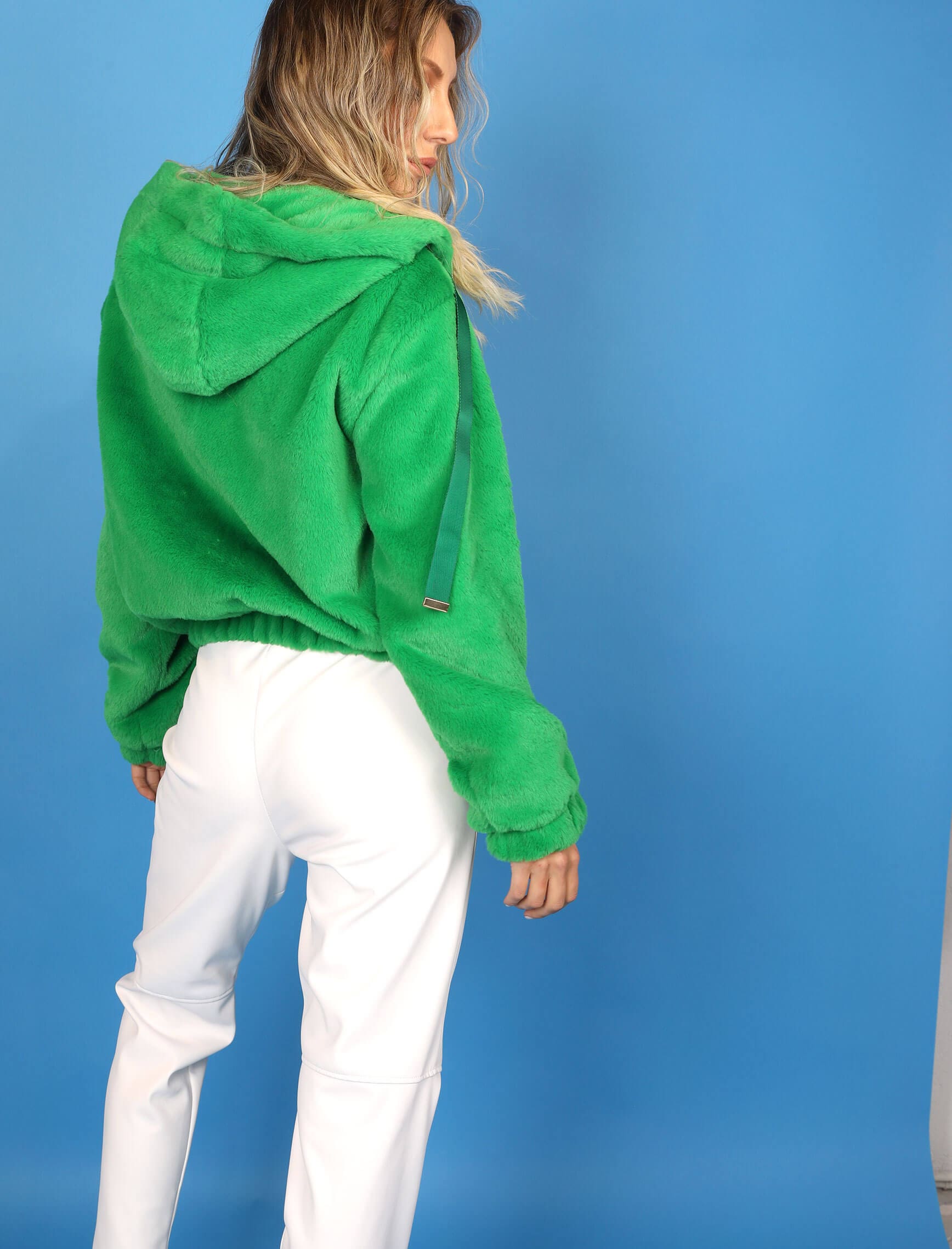 Yeşil Peluş Kapüşonlu Mont