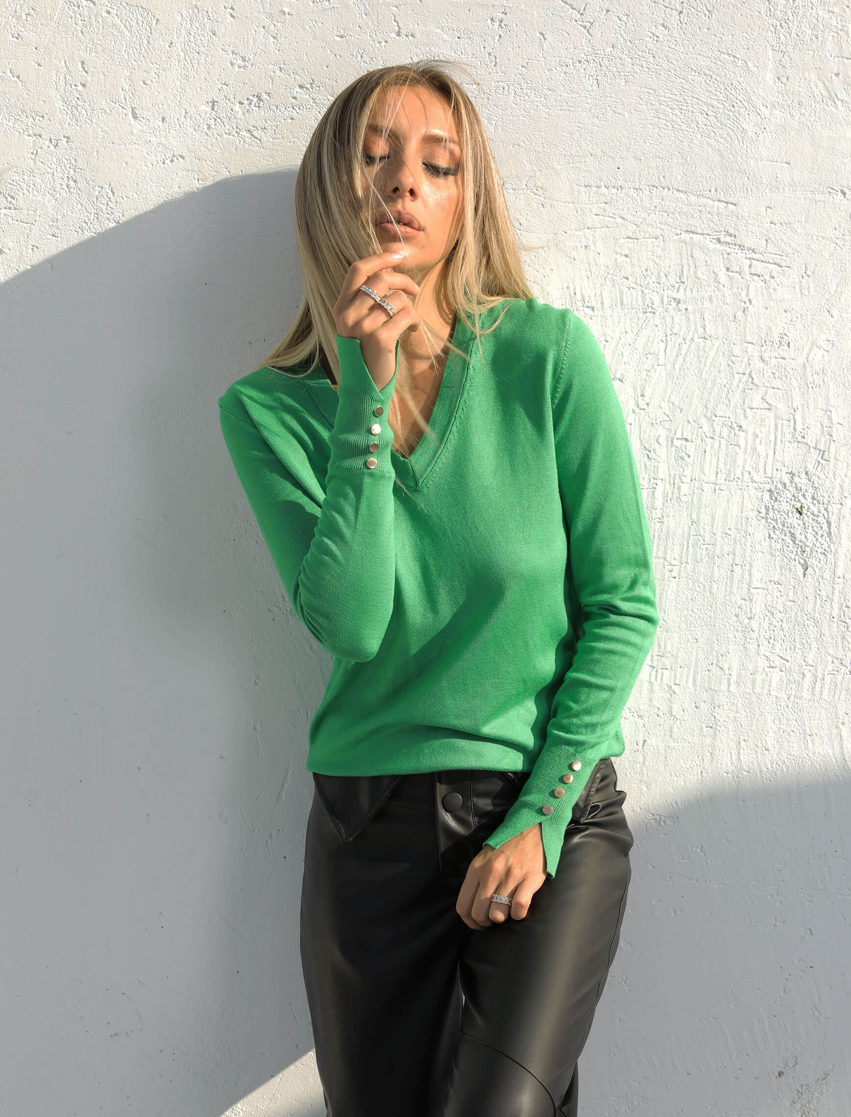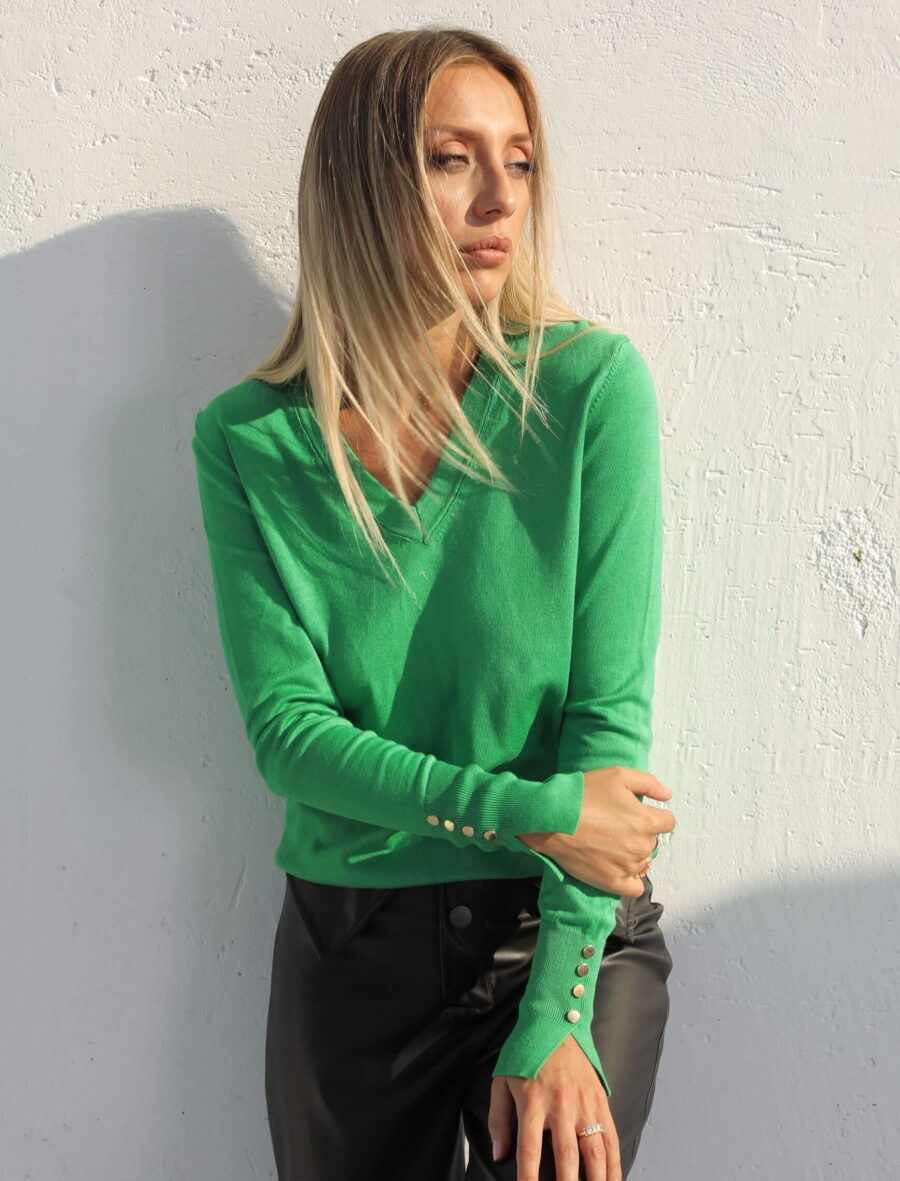 Yeşil V Yaka Kolu Yırtmaç Gold Trok Triko