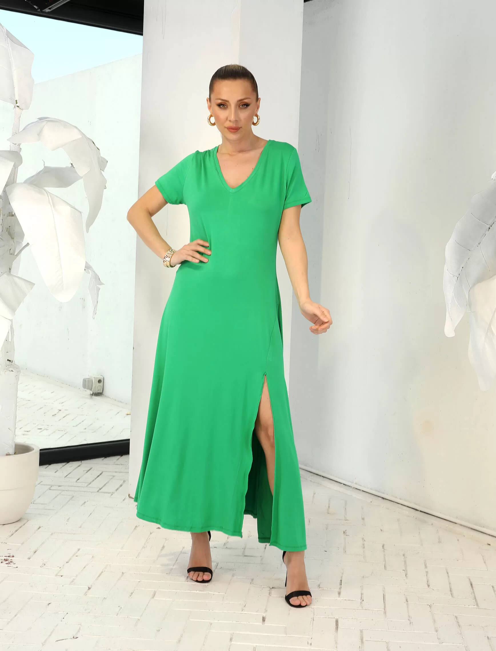 Yeşil V Yaka Yan Yırtmaç Elbise