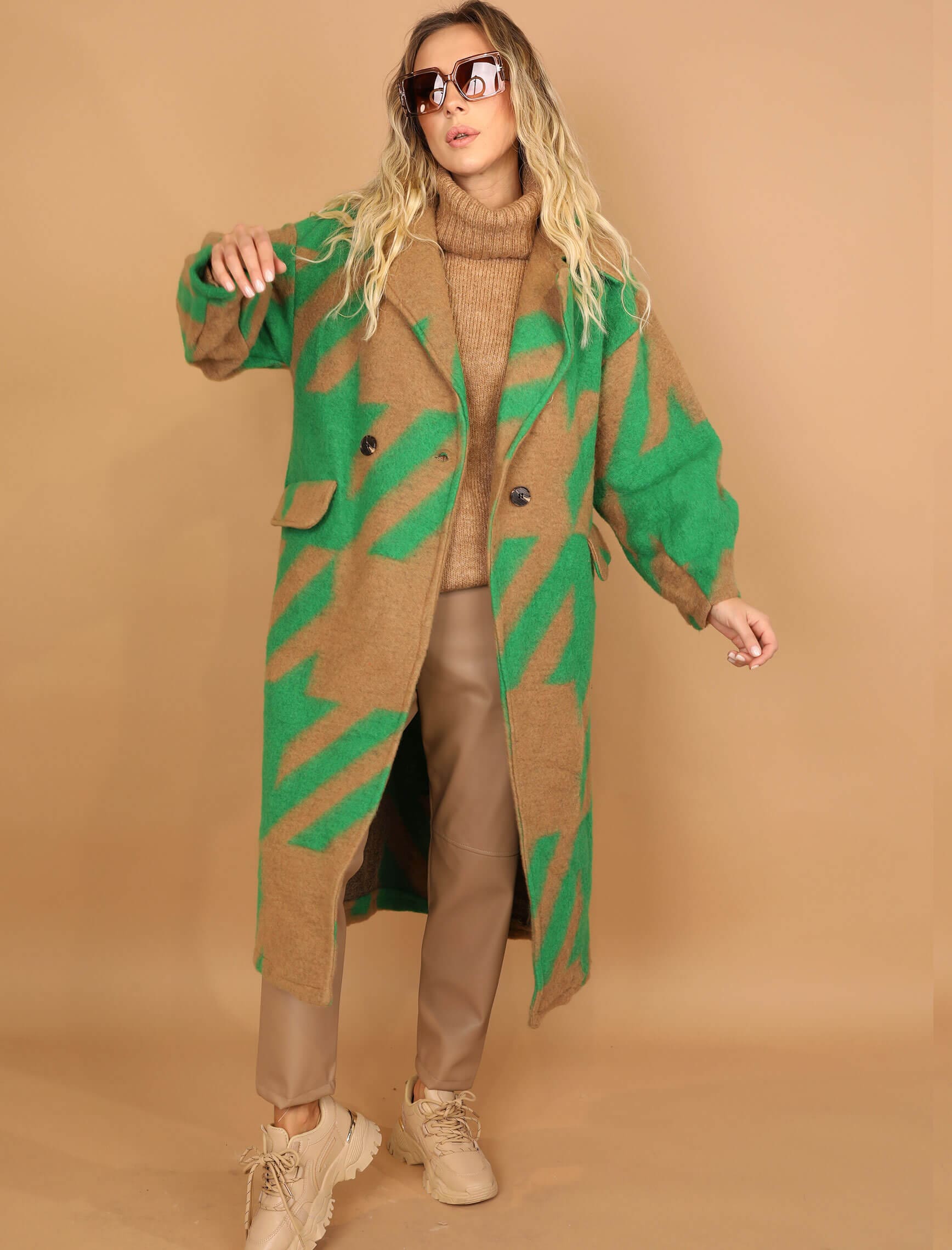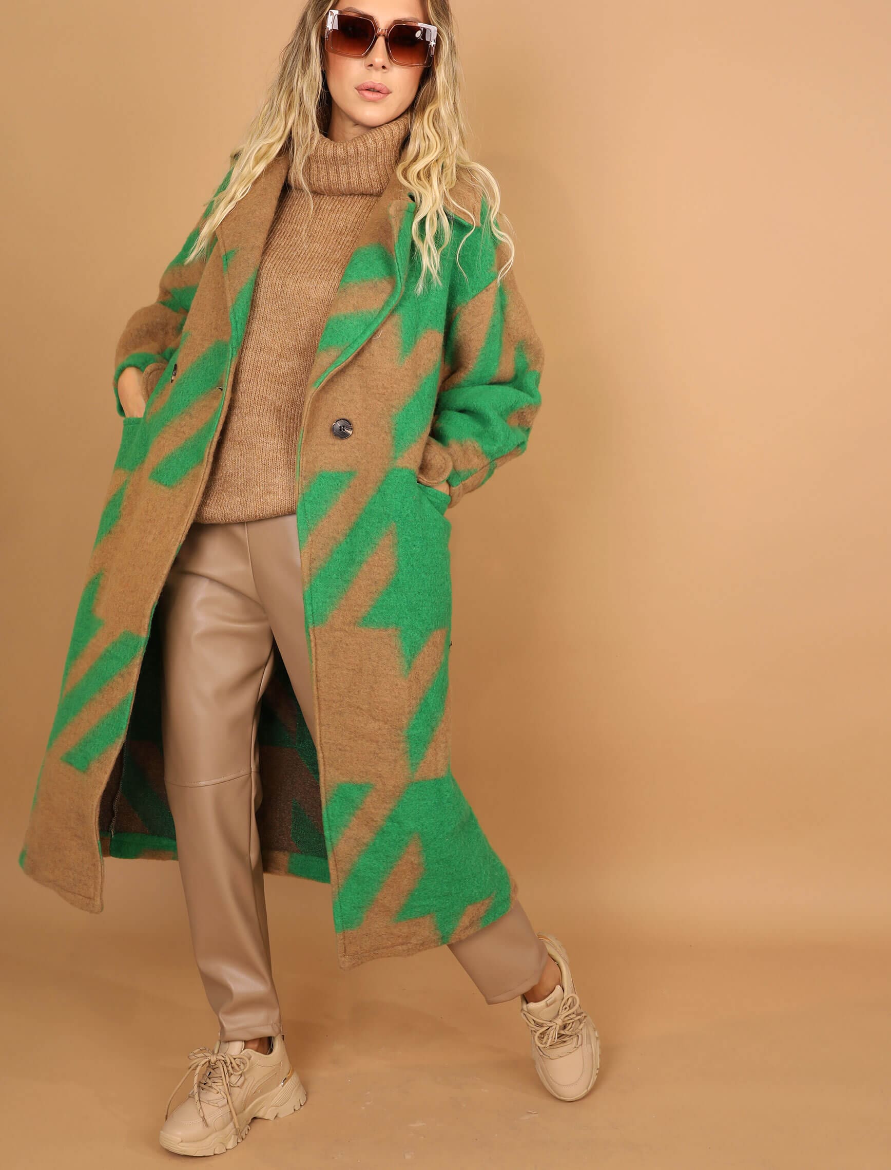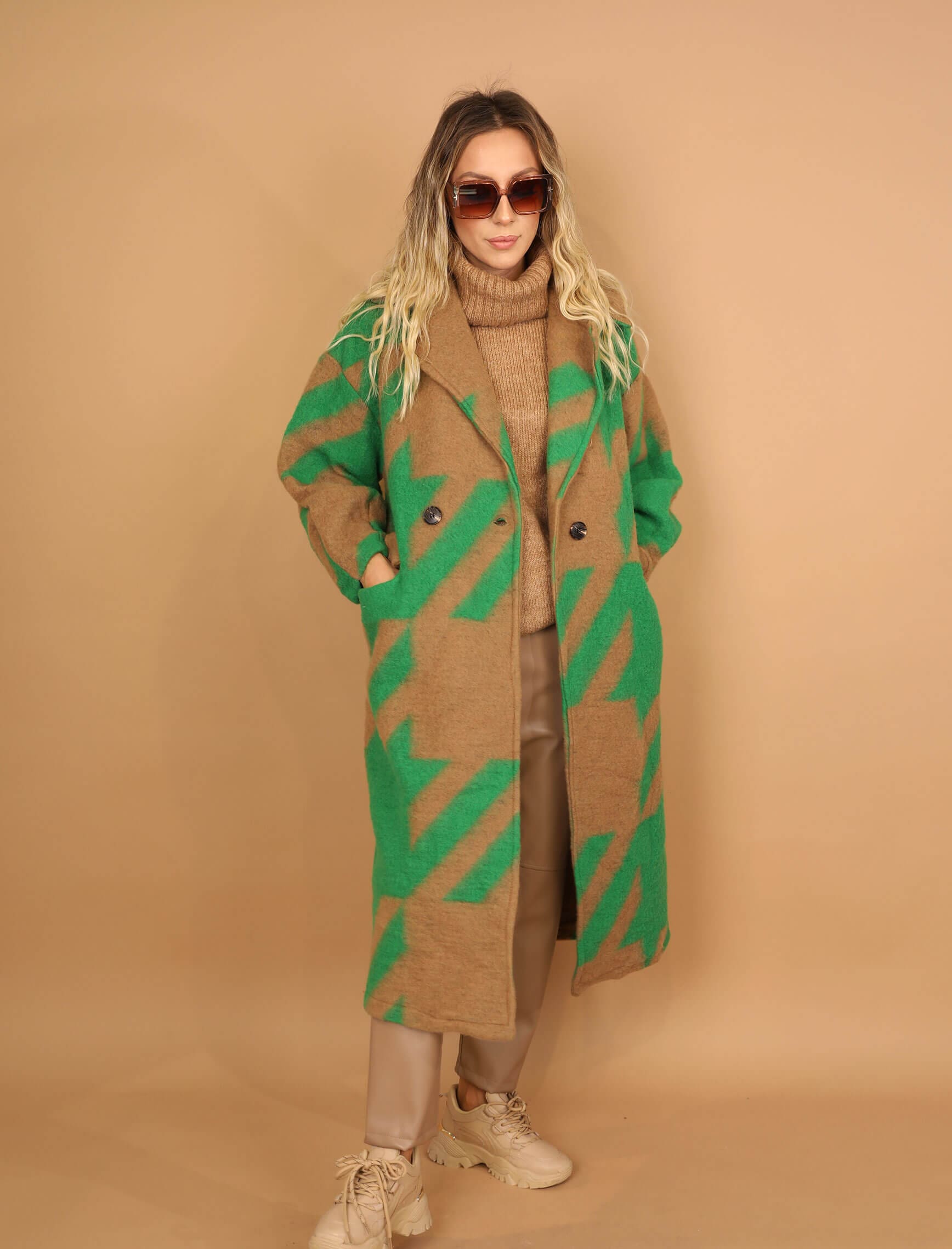 Yeşil Vizon Kaz Ayağı Keçe Kaban